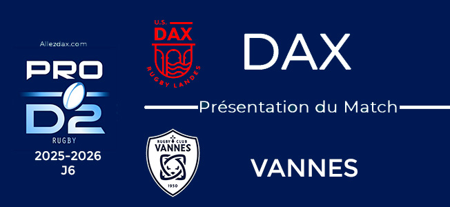 Nous savons tous que l’intensité du combat en rugby peut devenir un paramètre essentiel pour perturber, voire faire déjouer, les probables favoris … Et Vannes l’a déjà constaté sur le terrain des Montois le 12 septembre (30/28), puis à Aurillac vendredi dernier où leur 2ème mi-temps fanny a failli leur coûter la victoire (17/22). Le groupe Dacquois doit donc jouer à 200% contre le favori désigné pour la remontée en Top 14 !