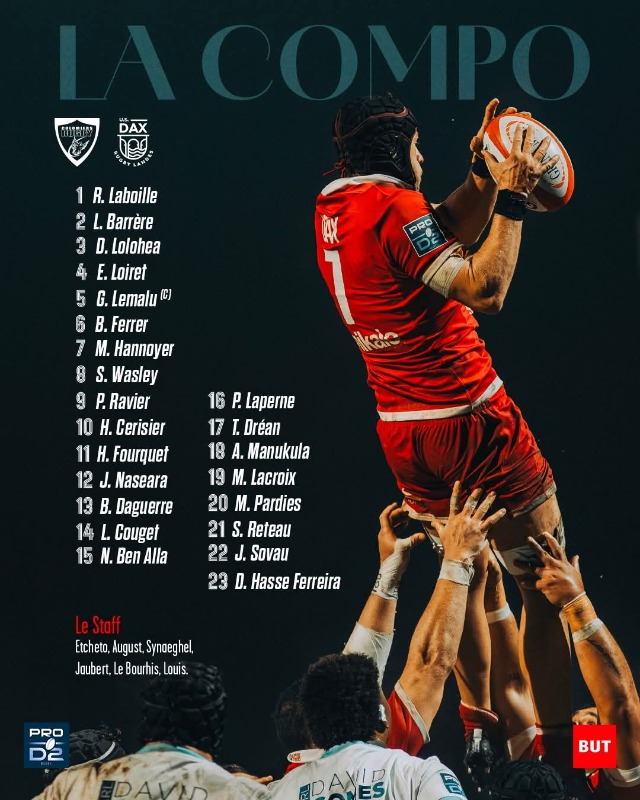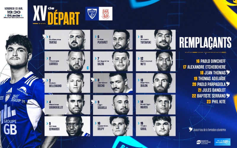 Le staff va faire tourner mais je pense sans faire n'importe quoi. On peut s'attendre aux rentrées de Laperne, Casadéi, Ferreira, Guillaume (qui était dans le groupe le weekend dernier), Ferrer, peut-être Lacroix, Wasley s'il est remis. Lemalu et Hannoyer qui ont peu joué pourraient aussi être du voyage. L. Barrère sera titulaire.