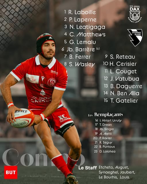 Le pilier Ali Oz (cheville) a rejoint à l’infirmerie le centre Danny Toala, le talonneur Peniami Narisia, le troisième ligne Loïc Godener, le centre Maëlan Rabut, le troisième ligne Pierre-Samuel Pacheco (épaule) et les ailiers Enzo Reybier et Gavin Stark. (commotion). Le deuxième ligne Alban Roussel et l’ouvreur Zack Holmes sont de retour dans un groupe qui intègre sept joueurs issus du centre de formation oyonnaxienne, à la faveur d’une importante rotation.