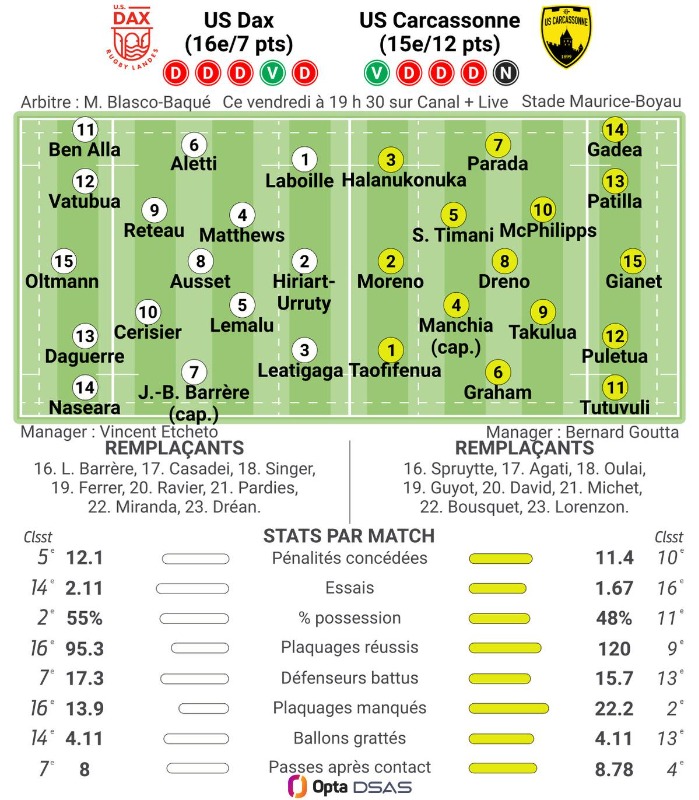 Le staff de l’US Carcassonne a dévoilé la composition de l’équipe pour le déplacement au stade Maurice-Boyau de Dax, ce vendredi soir (19 h 30), à l’occasion de la dixième journée de Pro D2.