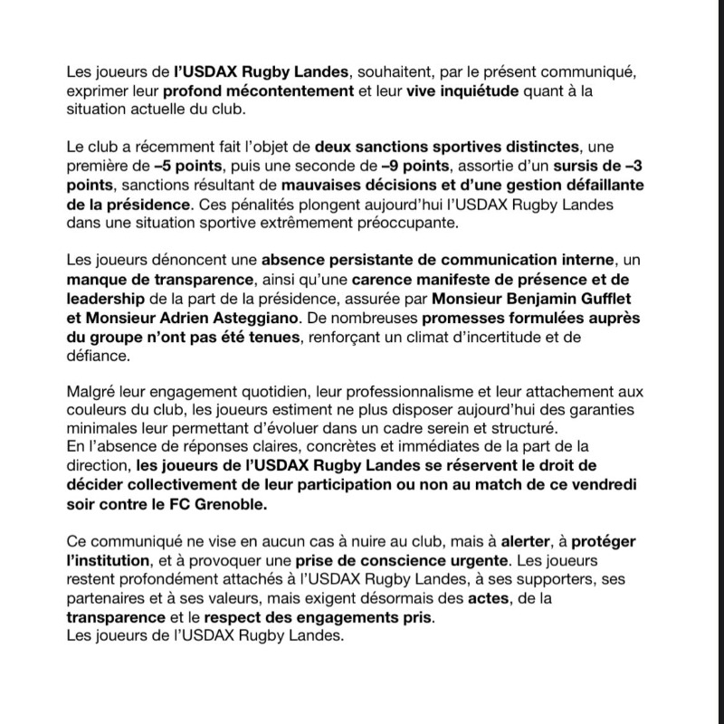 Soutiens totalement les joueurs . Ils ont raison plus de matches à Dax tant que Gufflet est président de toutes les façons le club avec lui est mort .