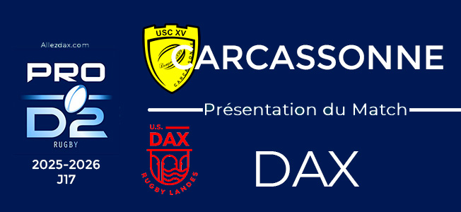 Un match qui va compter double entre deux équipes qui vont lutter pour la survie en ProD2 , l'équipe de Carcassonne n'avait pas présenté à Oyonnax ses joueurs majeurs pour les ménager, ils seront présents face à Dax, c'est dire l'importance majuscule qu'ils accordent à cette rencontre ... qu'ils ne veulent pas perdre !