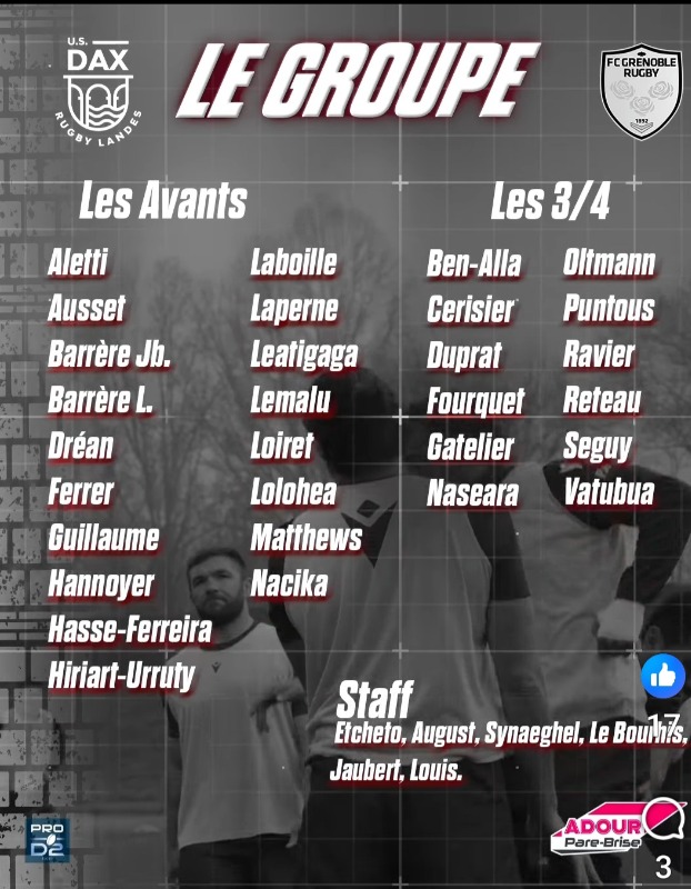 Quelques ajustements pour l'équipe qui rencontrera GRENOBLE .... sous réserve de modifs de dernière minute évidemment :