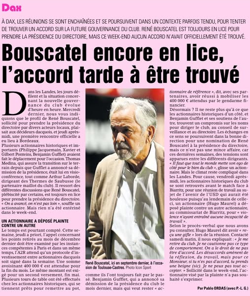 j'ai tenté d'entamer une action dans ce sens, non pas en franc tireur mais proposant avec l'assoc donc je suis membre; cela a été une fin de non recevoir car ce n'est pas le point de vue de la direction qui pretexte ne s'occuper que tu sportif; Je respecte leur point de vue mais qu'est le sportif sans direction ? rien; Pour moi l'USD est un tout : Une équipe, des dirigeants sportifs, un stade et des dirigeants administratifs et des supporters. Je suis sûr que parmi vous il y a des supporters qui ont le même point de vue que moi. En attendant que tout s'éclaircisse, je me mets en retrait jusqu'à nouvel ordre, non pas des idées mais des actions envers l'USD.
